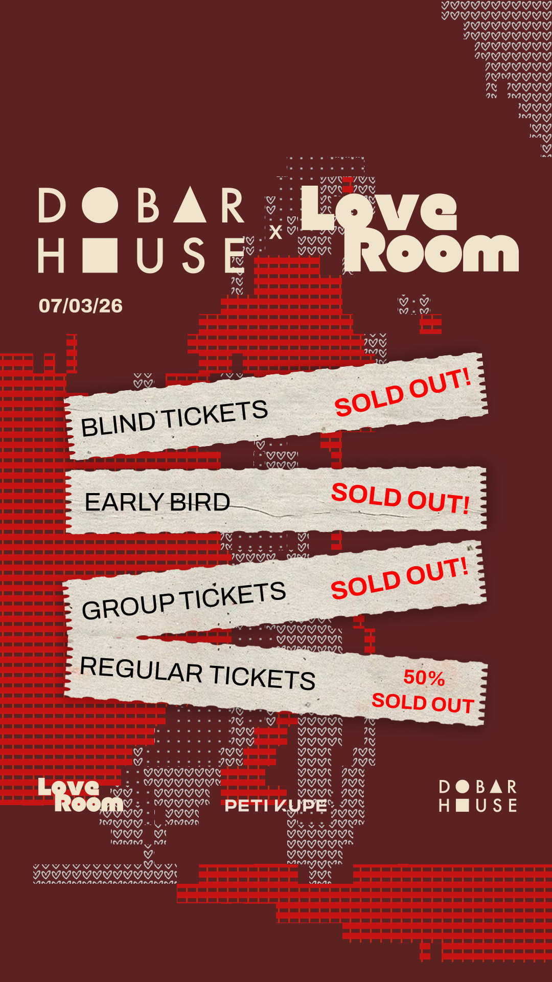 Static flyers feature a perforated post-it stamp aesthetic—ragged edges, textured paper look, and "stamped" overlays—to convey urgency and "the event is in town" messaging. Integrated Love Room's visual elements (bold typography, layered textures, heart motifs) alongside Dobar House branding for cohesive cross-promotion.