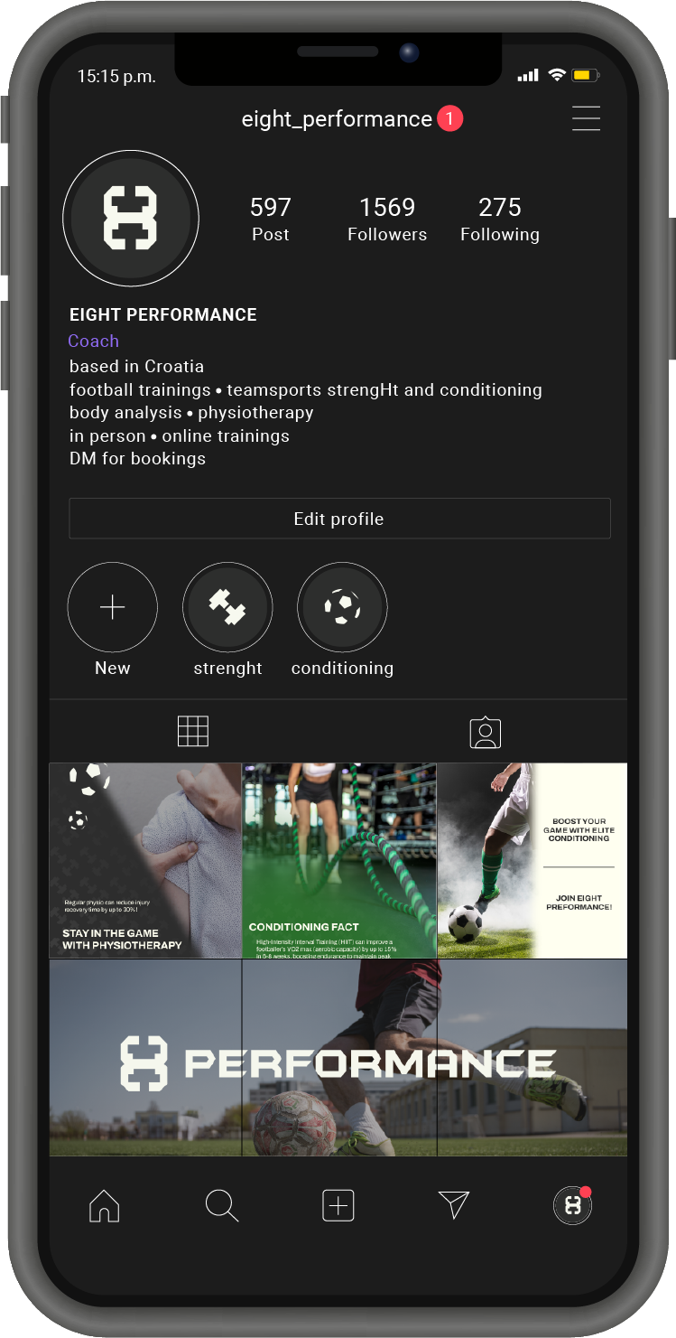 I crafted a distinctive visual identity for Eight Performance, a football fitness and training initiative, encompassing a logo (icon), logotype (icon + full name), color scheme, typeface, supplementary elements, and a unique pattern. The design is brought to life through a mockup featuring a branded water bottle and a conceptualized Instagram profile, offering a preview of its visual potential.