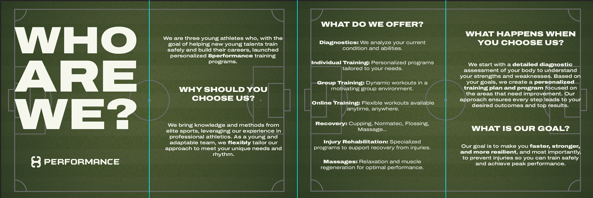 The logo draws inspiration from the number 8, styled in the classic football jersey format, with dumbbell ends shaping its openings. This symbolizes the brand’s core focus on football training, while also hinting at future gym-based offerings. The logotype pairs the logo with "Performance" in a sharp-edged typeface that mirrors the icon’s boldness, adding a dynamic, speed-driven feel to underscore the emphasis on conditioning.
