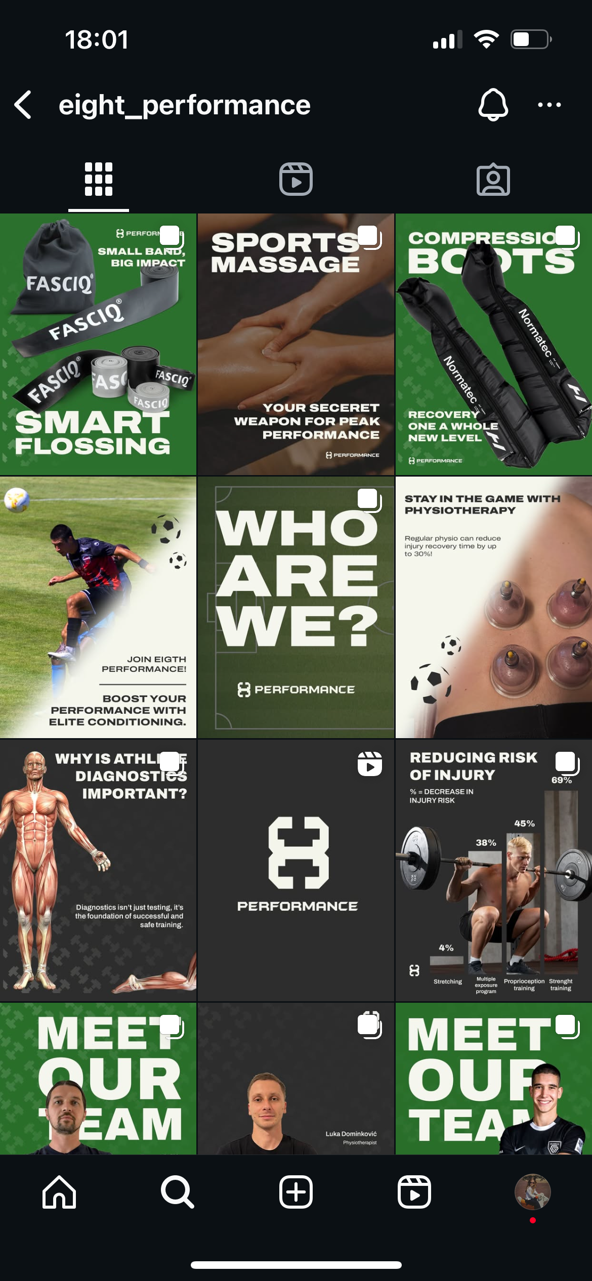 The color palette blends off-white and dark gray for a refined, eye-friendly aesthetic over pure white and black, paired with green to reflect the football field vibe. This choice of green as a secondary color stands out, as it’s unused by other Zagreb gyms in their branding. The Instagram mockup includes sample posts, providing a basic yet effective vision for the brand’s digital presence.